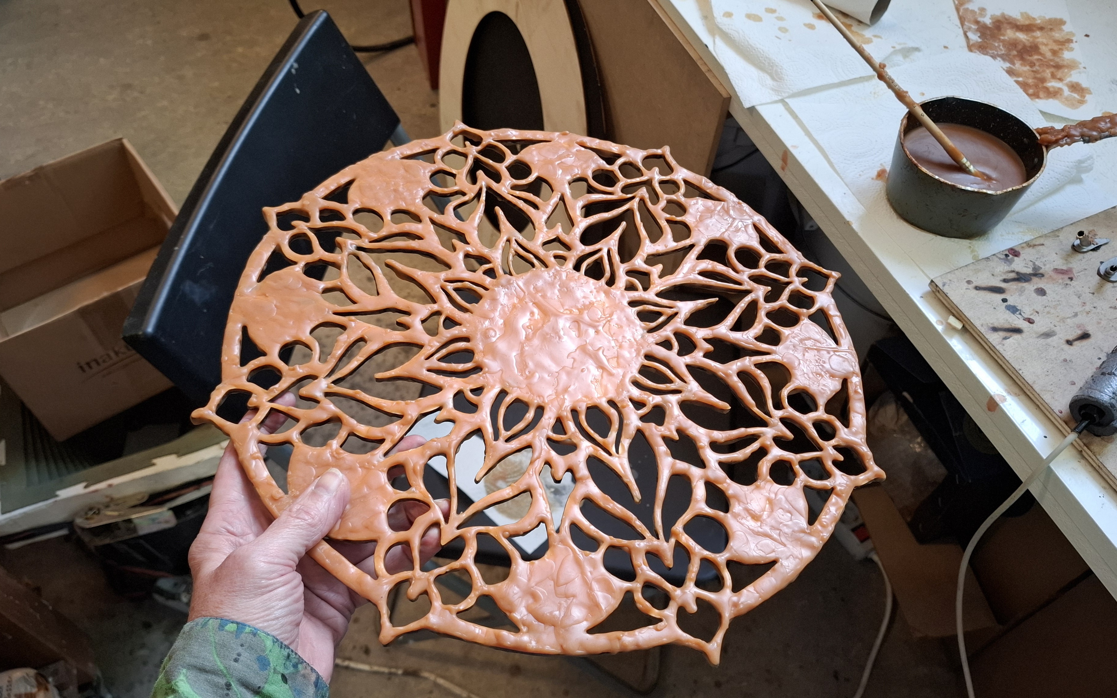 Vorderingen! Uiteindelijk, na wikken en wegen, tóch gekozen voor een andere voet bij mijn nieuwste beeld. Zo gaan die dingen. De gedraaide pyramide-achtige trap zinde mij niet en dus heb ik een ander ontwerp gemaakt. Gekozen voor de eeuwigheidswaarde van een cirkel. Het was een Zen precisiewerkje, maar erg leuk om te maken. De mandala heeft zijn oorsprong in het hindoeïsme en later ook in het boeddhisme. Deze heilige cirkel staat symbool voor de oneindigheid van het universum en wordt vaak gebruikt bij meditaties.