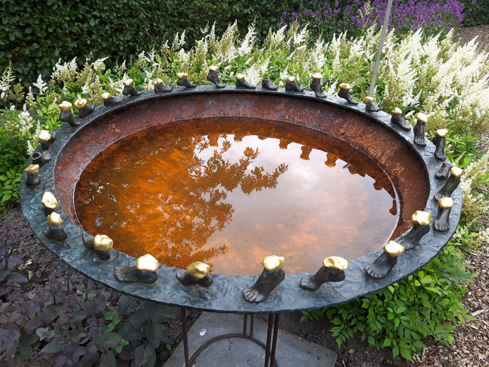 We wandelen door de tijd, zijn druk, we zoeken en verlangen. Wat zijn de werkelijke schatten van het leven? Materiaal: brons, bladgoud & cortenstaal (verkocht)