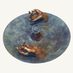 2011Door te mediteren kom je in een andere tijdsbeleving en stil je de tijd. De bol van bergkristal staat symbool voor innerlijke rust en een heldere geest. Zij 'drijft' op het water in de schaal, spiegel van de ziel.(Verkocht)